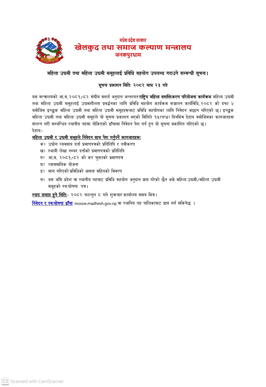 » महिा उधमी तथा महिला उधमी समूहलाइ प्रविधि सहयाेग उपलब्ध गराउने सम्बन्धि सूचना !